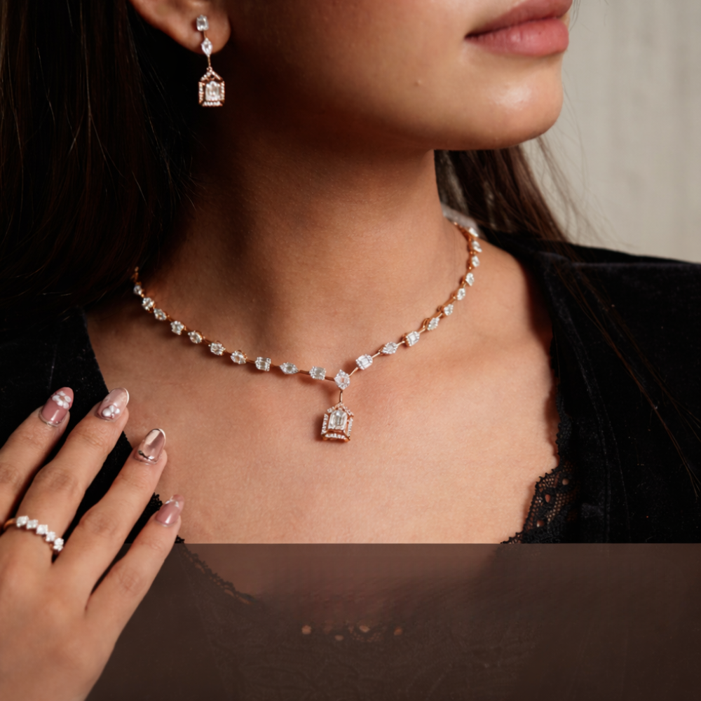 An elegant 18KT gold diamond necklace set featuring delicate blue stone drops and matching earrings. Crafted for timeless elegance and refined occasions.